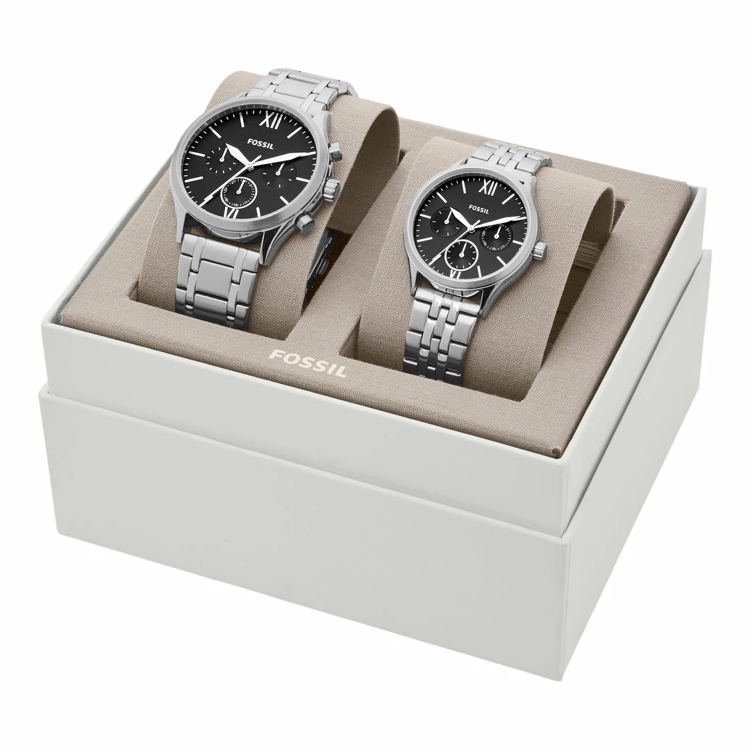 This gift set features 44mm and 36mm Fenmore Midsize watches, with matching black satin dials, multifunction movement and silver-tone stainless steel bracelets.