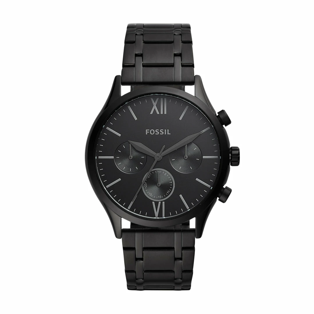 This 44mm Fenmore Midsize features a black satin dial with Roman numerals at the six- and 12-hour markers, multifunction movement and a black stainless steel bracelet. Designed exclusively for Fossil Outlet.