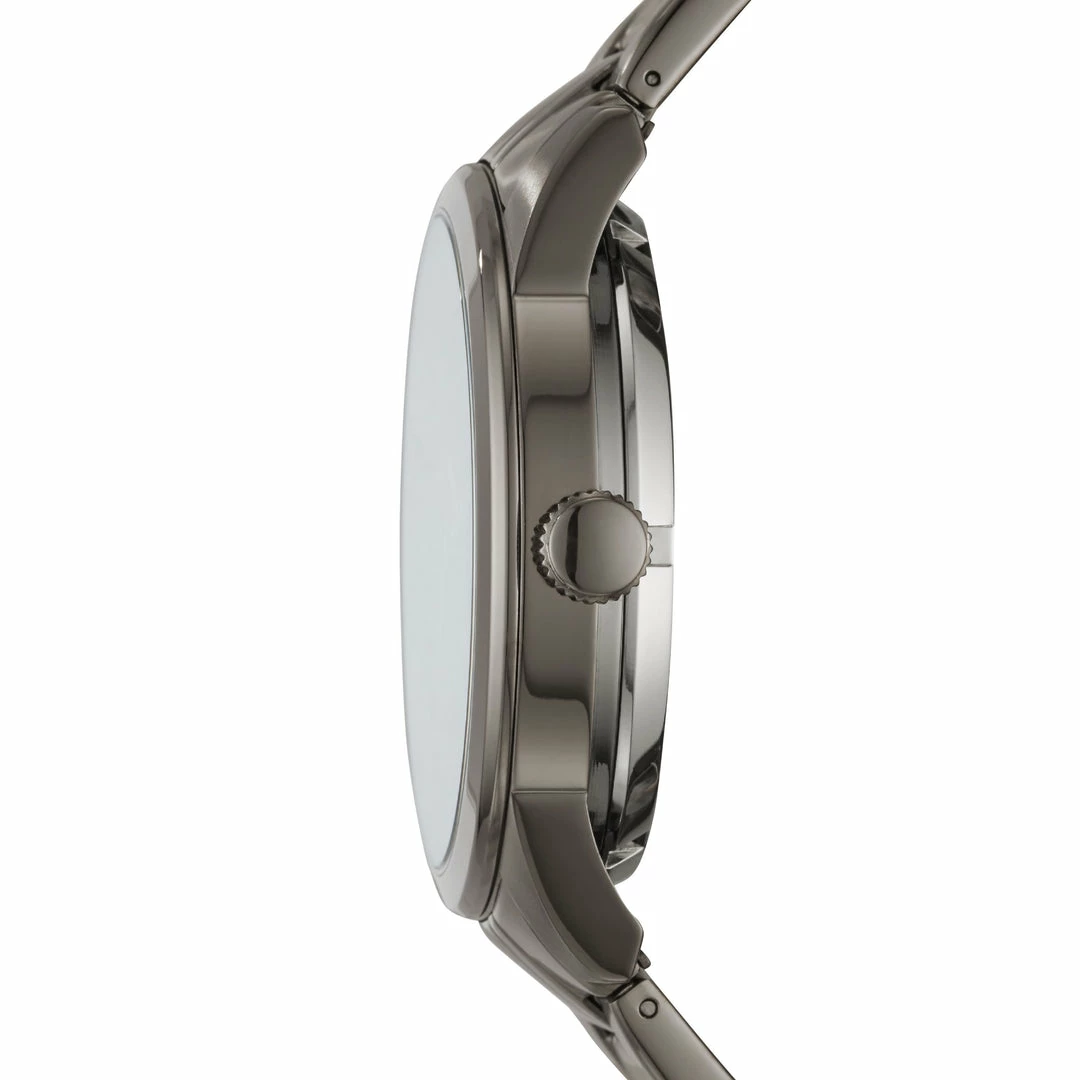 This 48mm Flynn features a gray dial with Roman numeral and stick indices, automatic movement and gunmetal stainless steel bracelet.