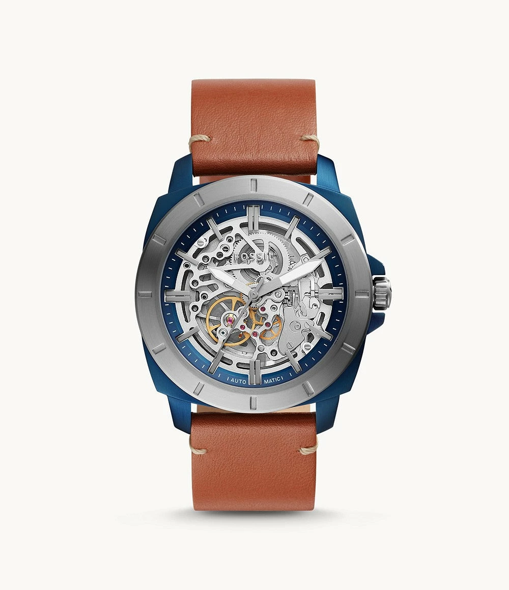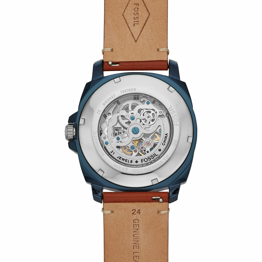 This 45mm Privateer Sport features a see-through dial, mechanical movement and a luggage leather strap. Designed exclusively for Fossil Outlet.
