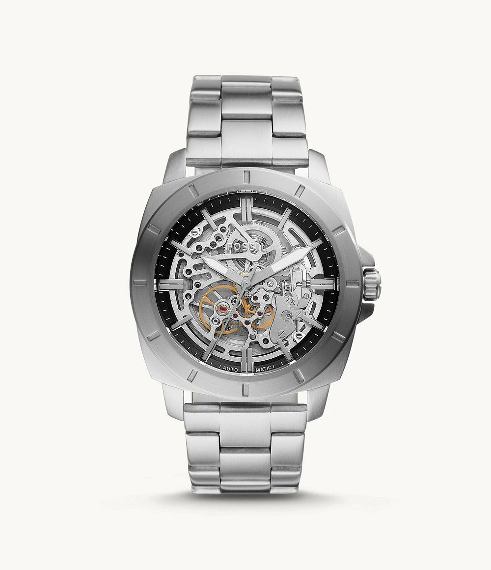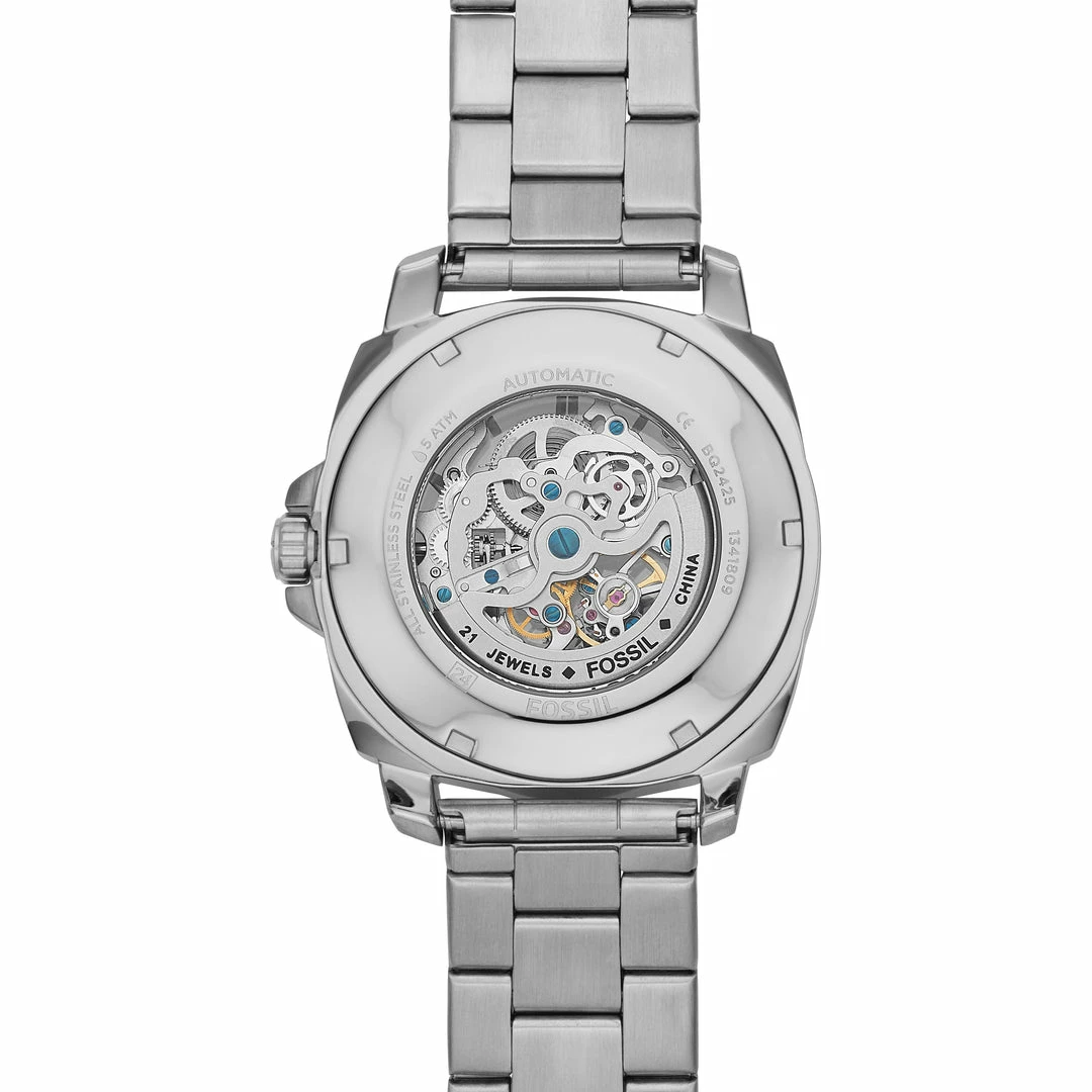This 45mm Privateer Sport features a see-through dial, mechanical movement and a stainless steel bracelet. Designed exclusively for Fossil Outlet.