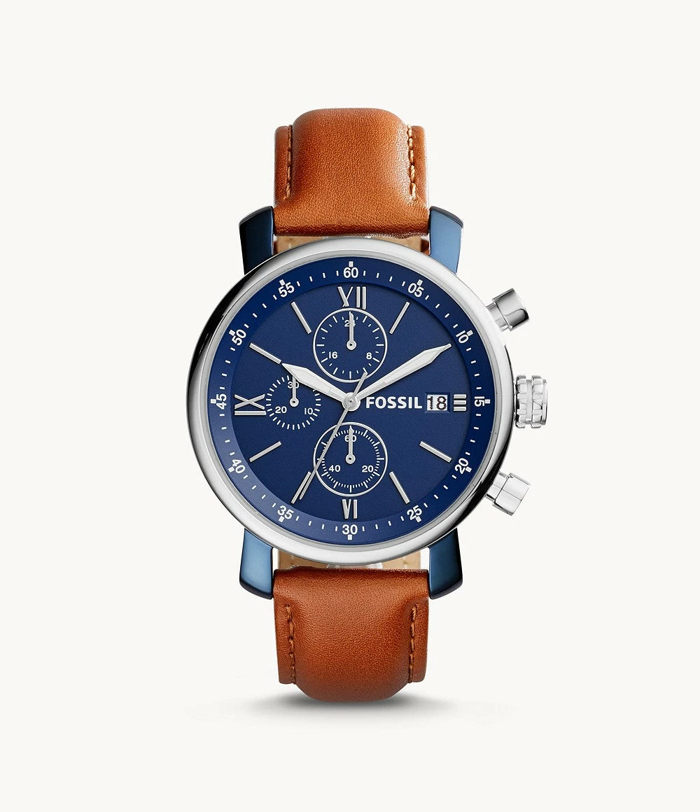 The perfect work-to-weekend styleβour handsome Rhett chronograph boasts an ocean blue stainless steel case and smooth leather strap.