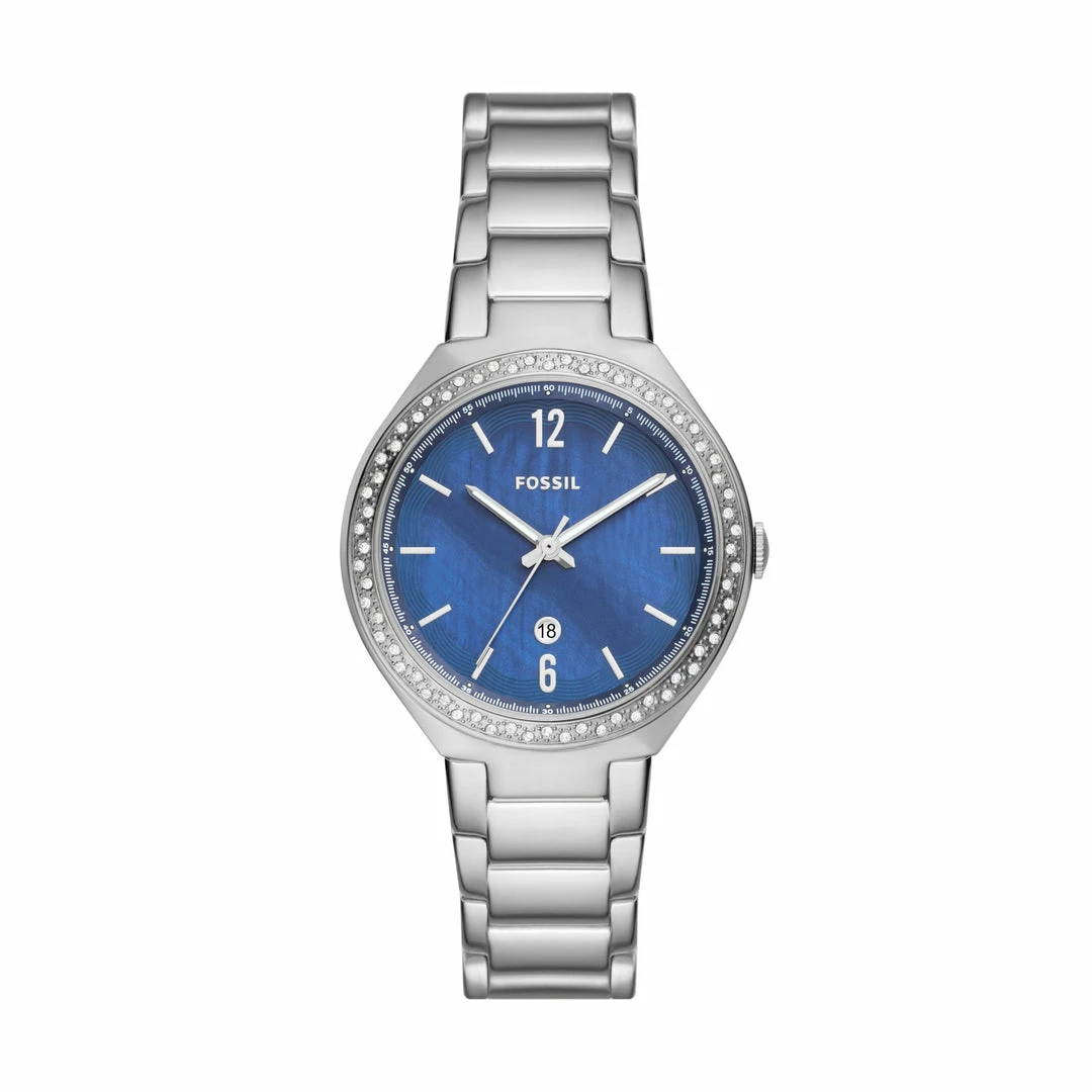 This 36mm Ashtyn watch features a blue mother of pearl dial, three-hand date movement and stainless steel bracelet.