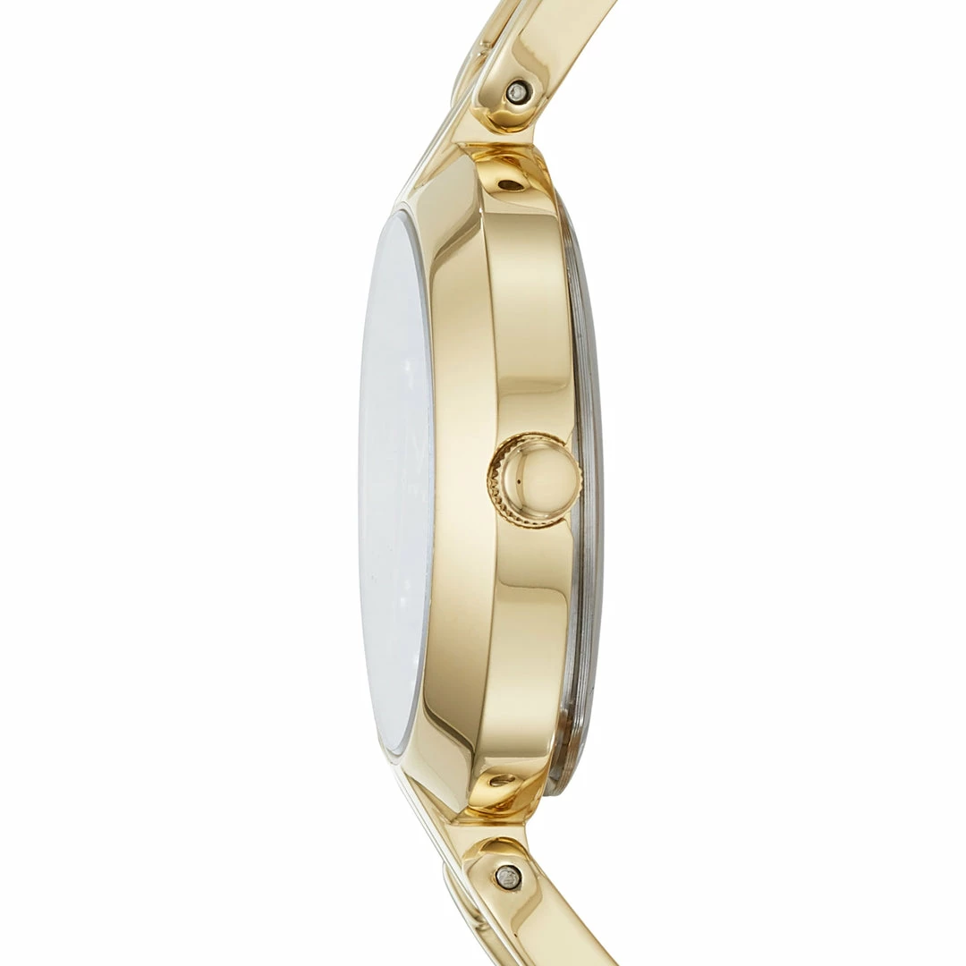 This 32mm Kerrigan watch features a white semi-gloss dial, three-hand movement and gold-tone stainless steel bracelet.