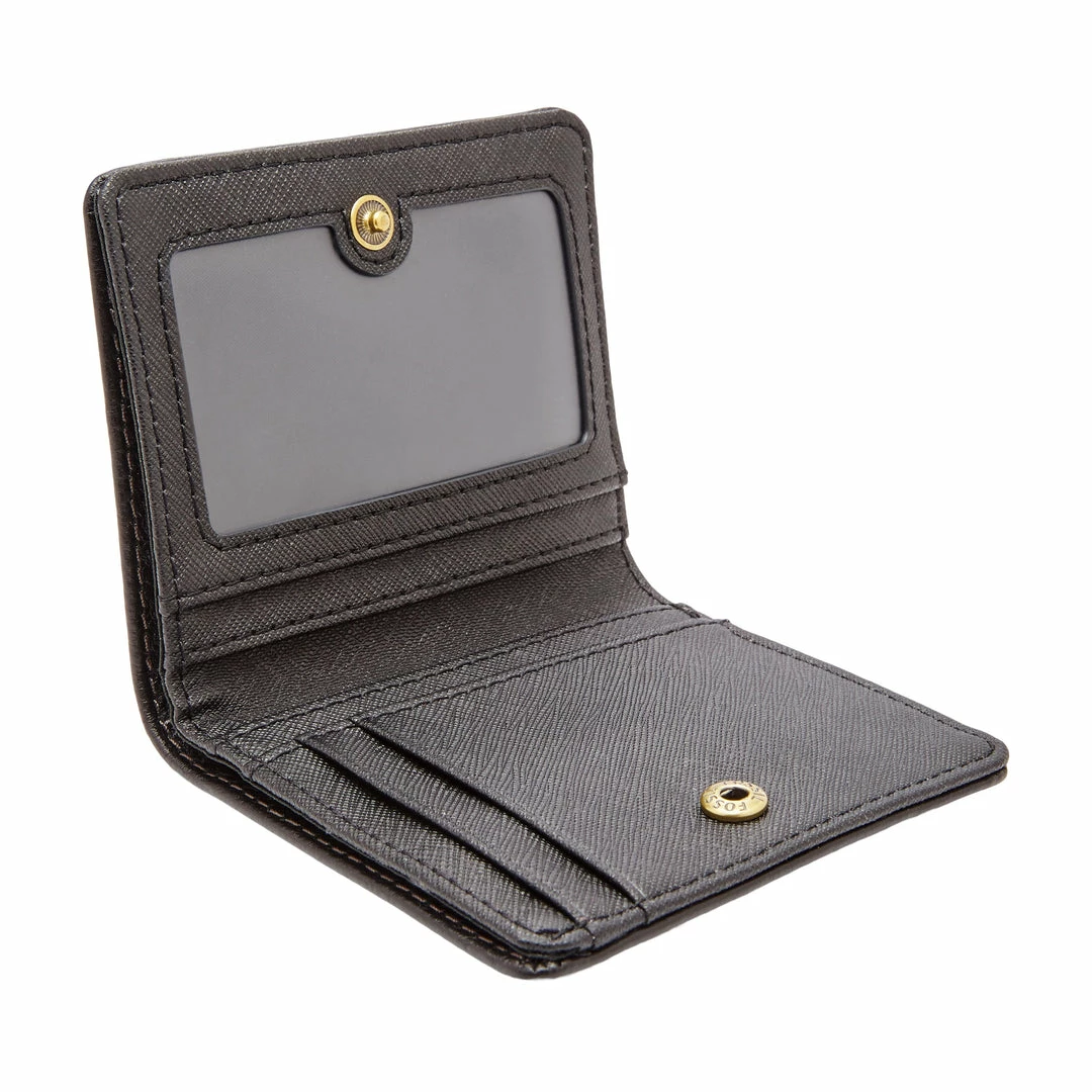 This leather bifold featurs 1 ID window, 5 credit card slots and 1 back zip pocket.