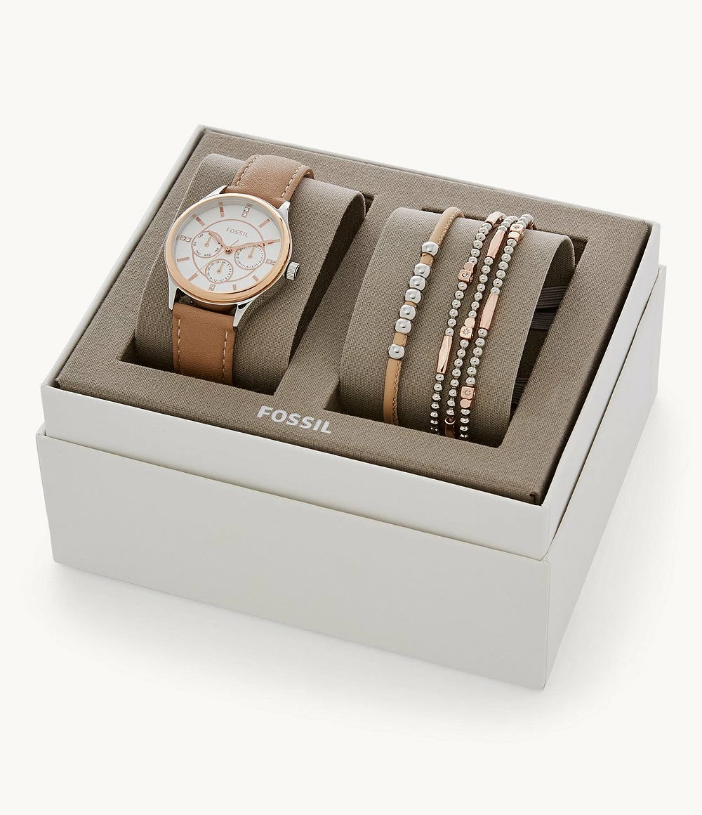This box set features the Modern Sophisticate multifunction in tan leather with two beaded bracelets. Designed exclusively for Fossil Outlet.